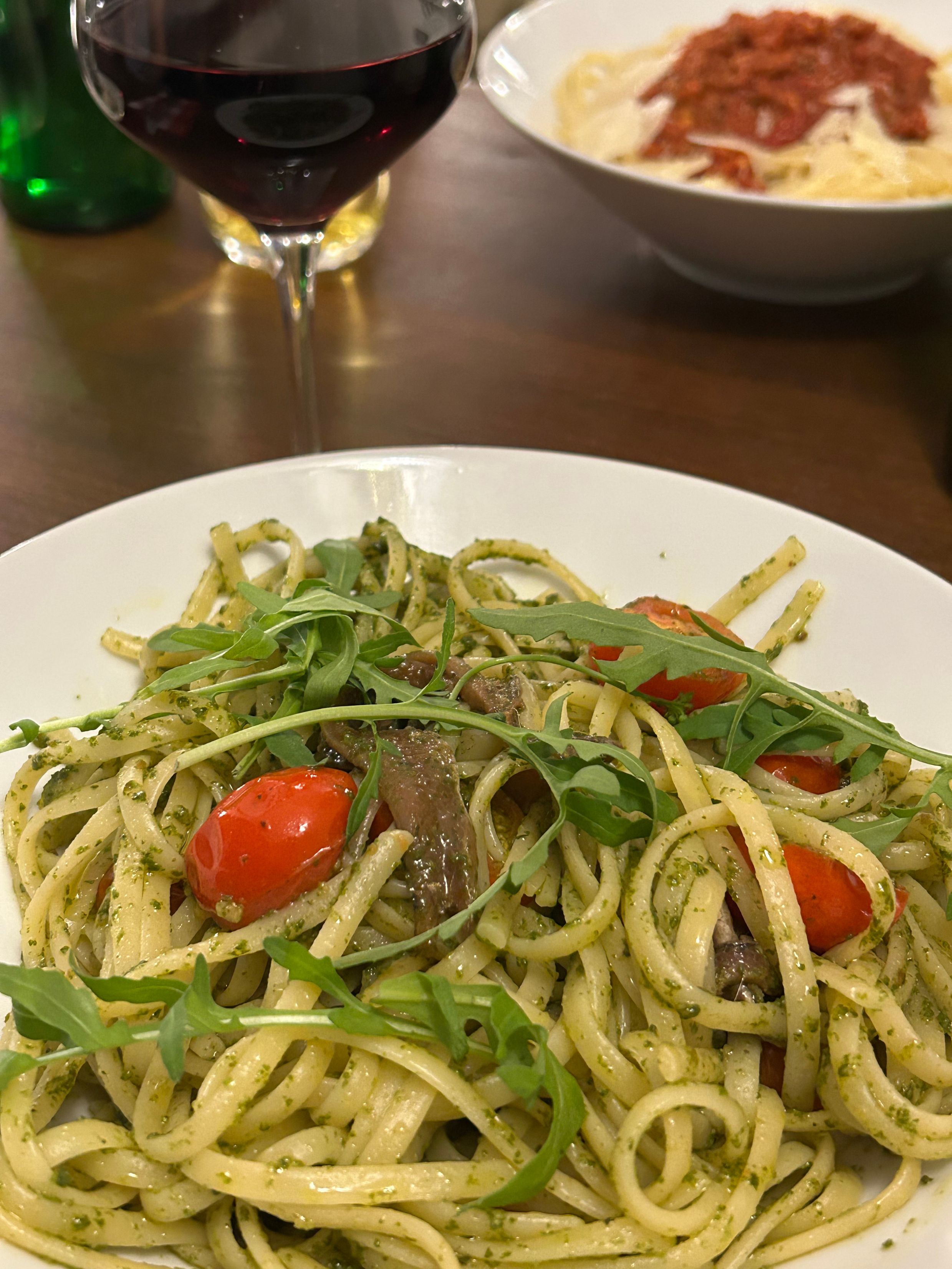 Pasta mit Pesto: Dieses Gericht besteht aus Linguine, Rucola, Kirschtomaten, Sardellen, grünem Pesto und Olivenöl. Es wird frisch zubereitet und in einem tiefen Teller mit etwas Käse serviert. Dieses Gericht ist frisch und leicht und schmeckt nach Basilikum. Man isst es das ganze Jahr über, aber mich persönlich erinnert es an den Sommer.