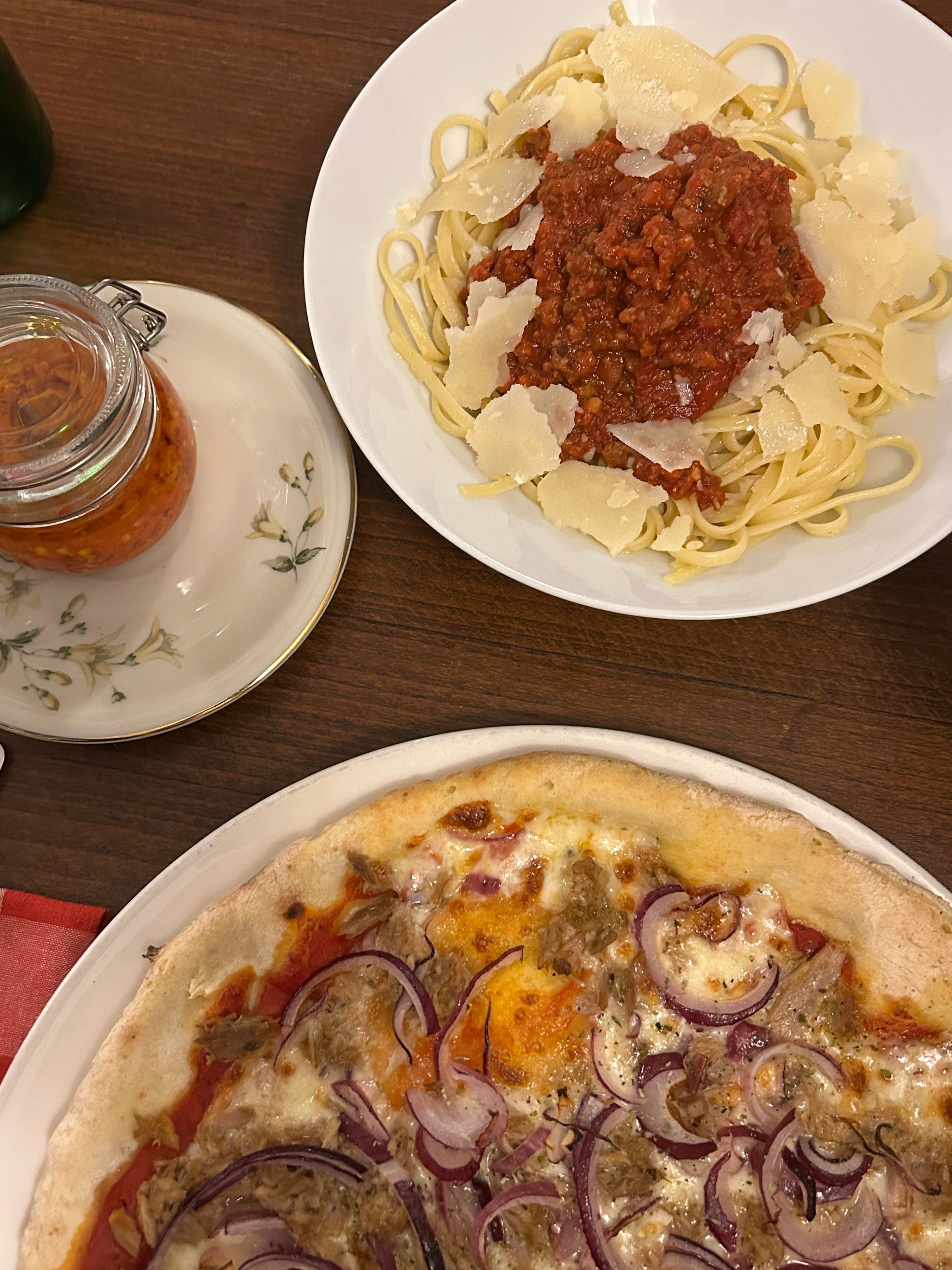 | Wir haben Pasta und Pizza gegessen. Meine Eltern haben Pasta mit Pesto und Sardellen und Pasta Bolognese bestellt. Und ich habe eine Pizza mit Thunfisch genommen. | |